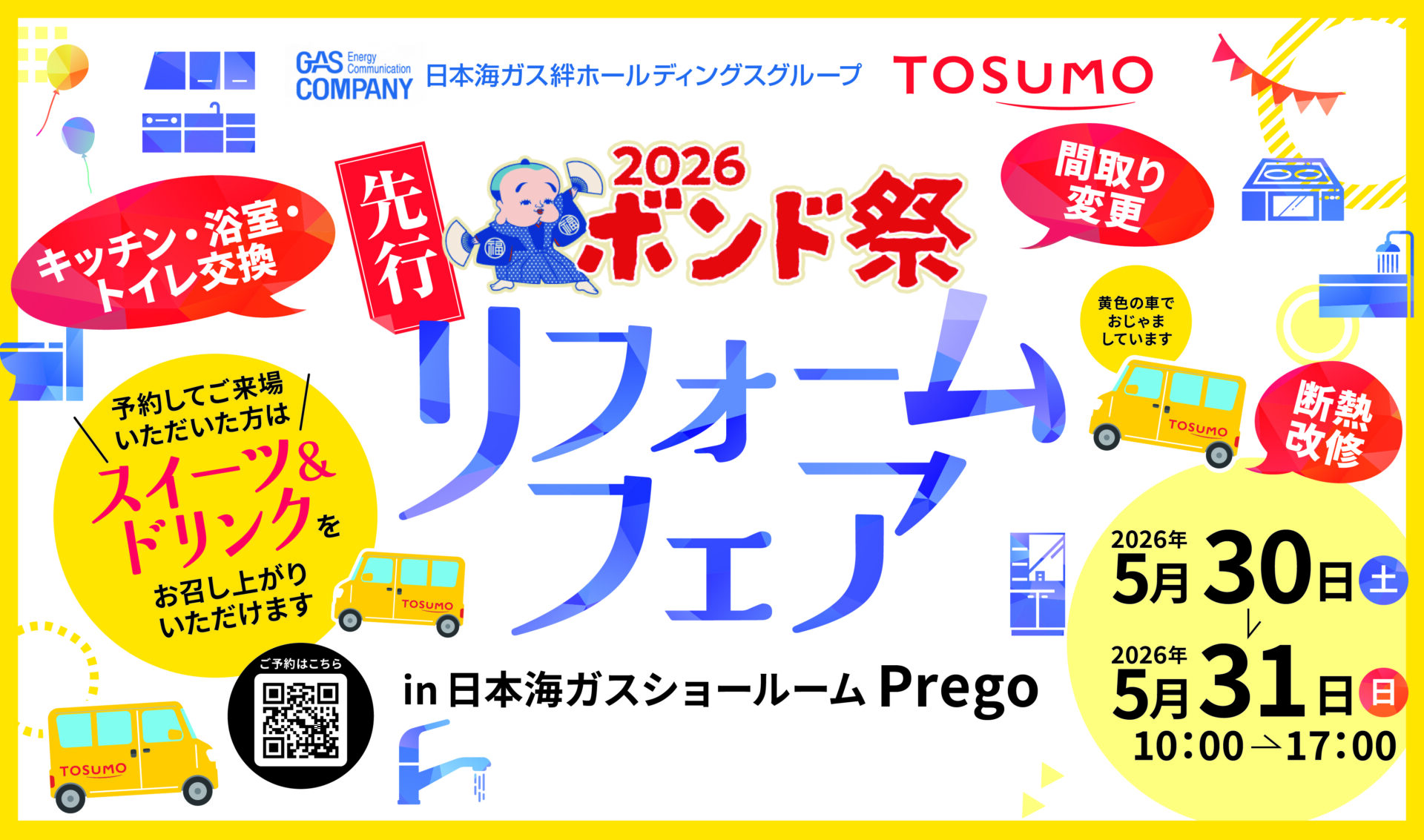 5月30日、31日 日本海ガス絆ホールディングスグループの株式会社TOSUMO建築設計は、グループ5社とパートナー企業が一体となった豪華な祭典「2026ボンド祭 リフォームフェア」を開催いたします 。