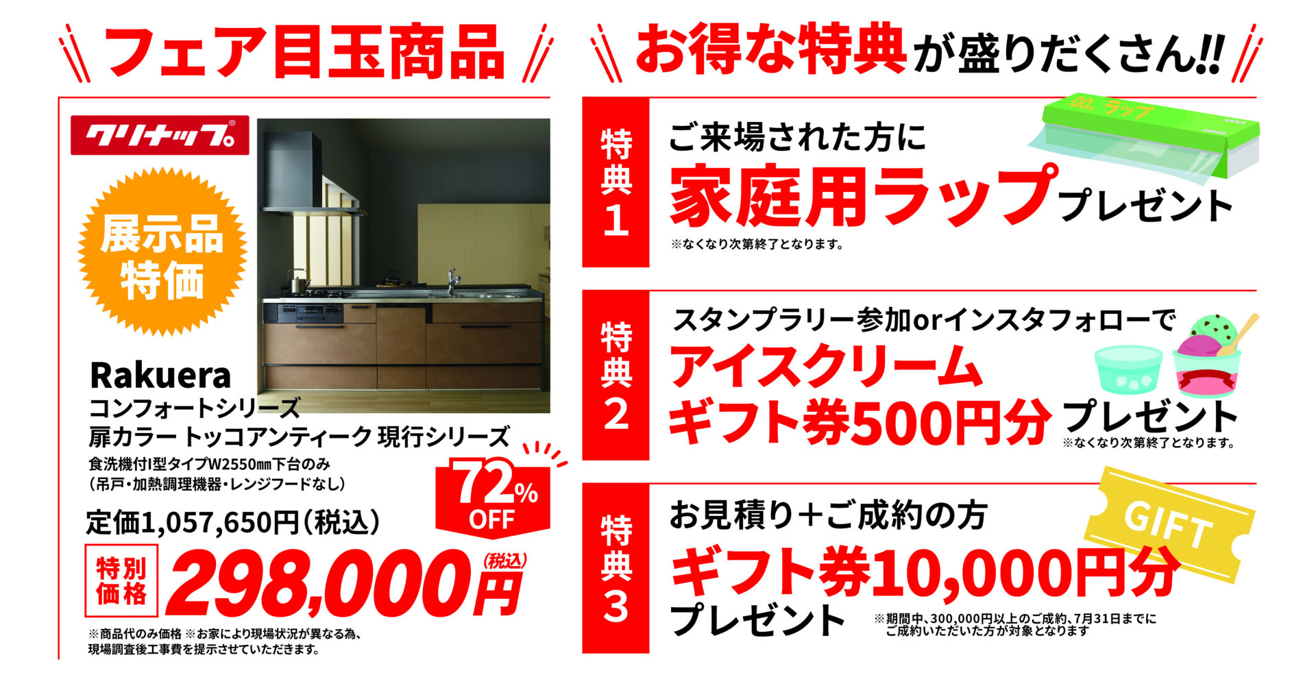 ご来場特典として家庭用ラップのプレゼントがあるほか、スタンプラリーへの参加やSNSフォローでアイスクリームギフト券も進呈いたします 。また、事前予約の上でご来場いただいた方には、スイーツとドリンクのおもてなしもご用意しております 。