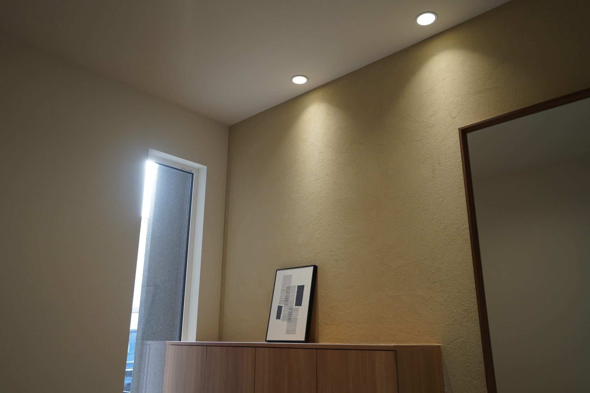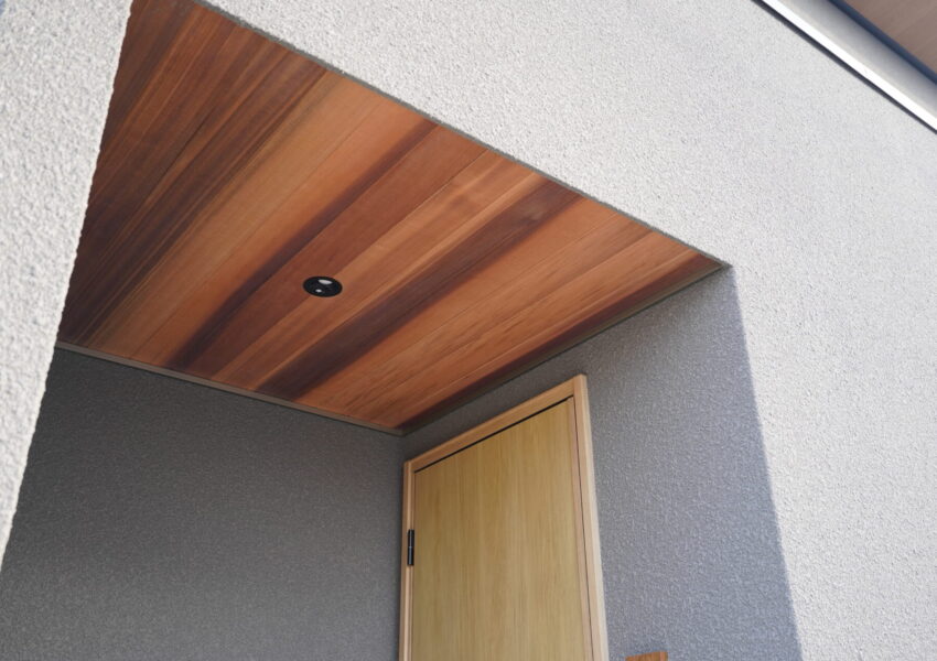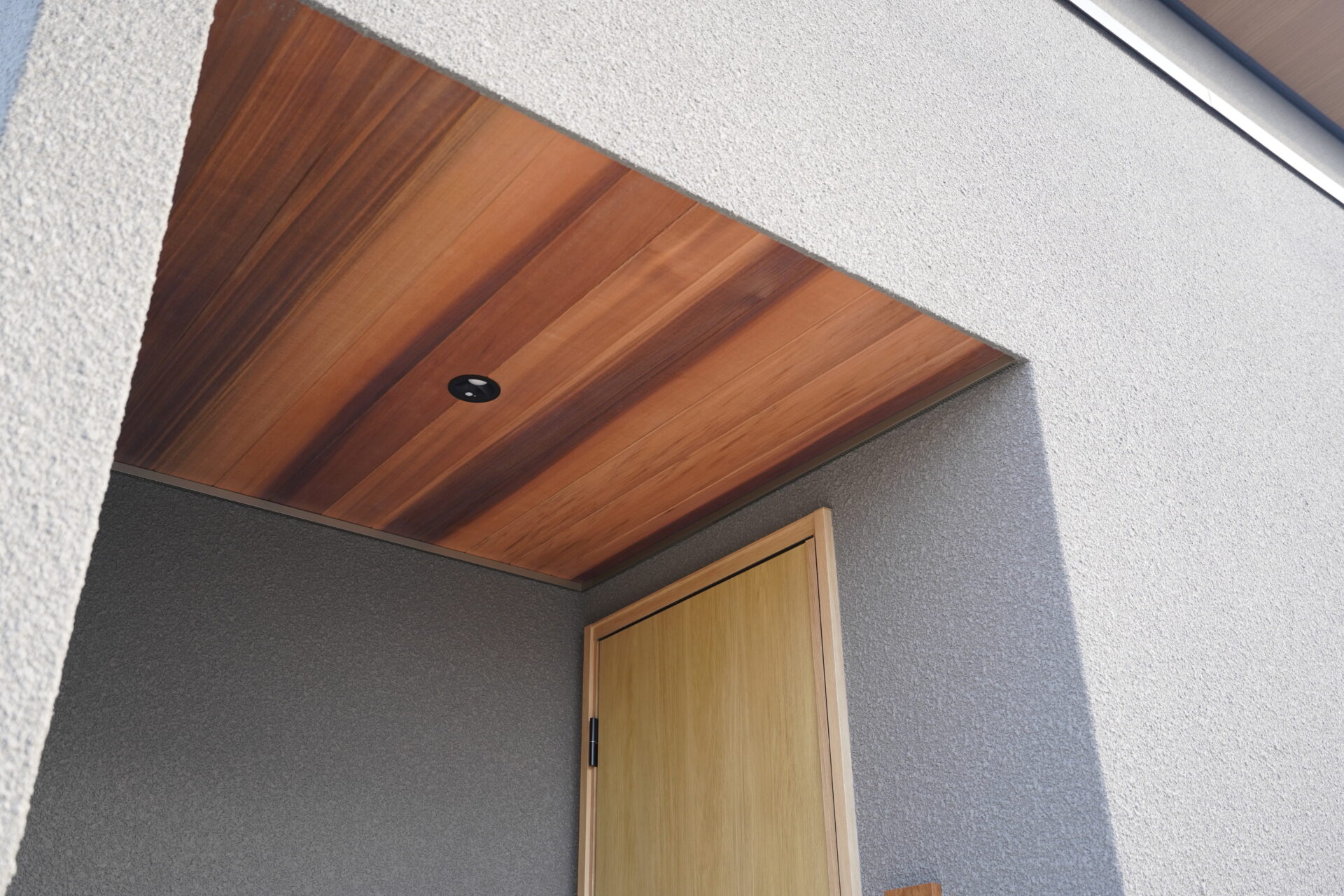 外観は塗り壁と木目の軒裏で、上品さとあたたかさを両立。