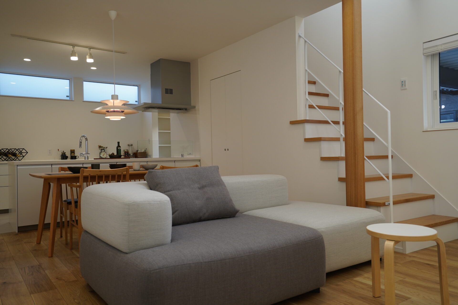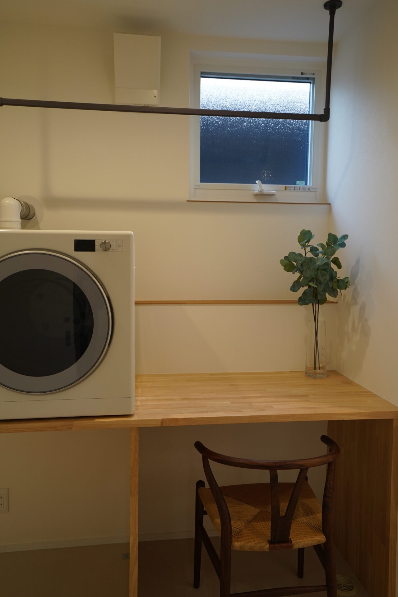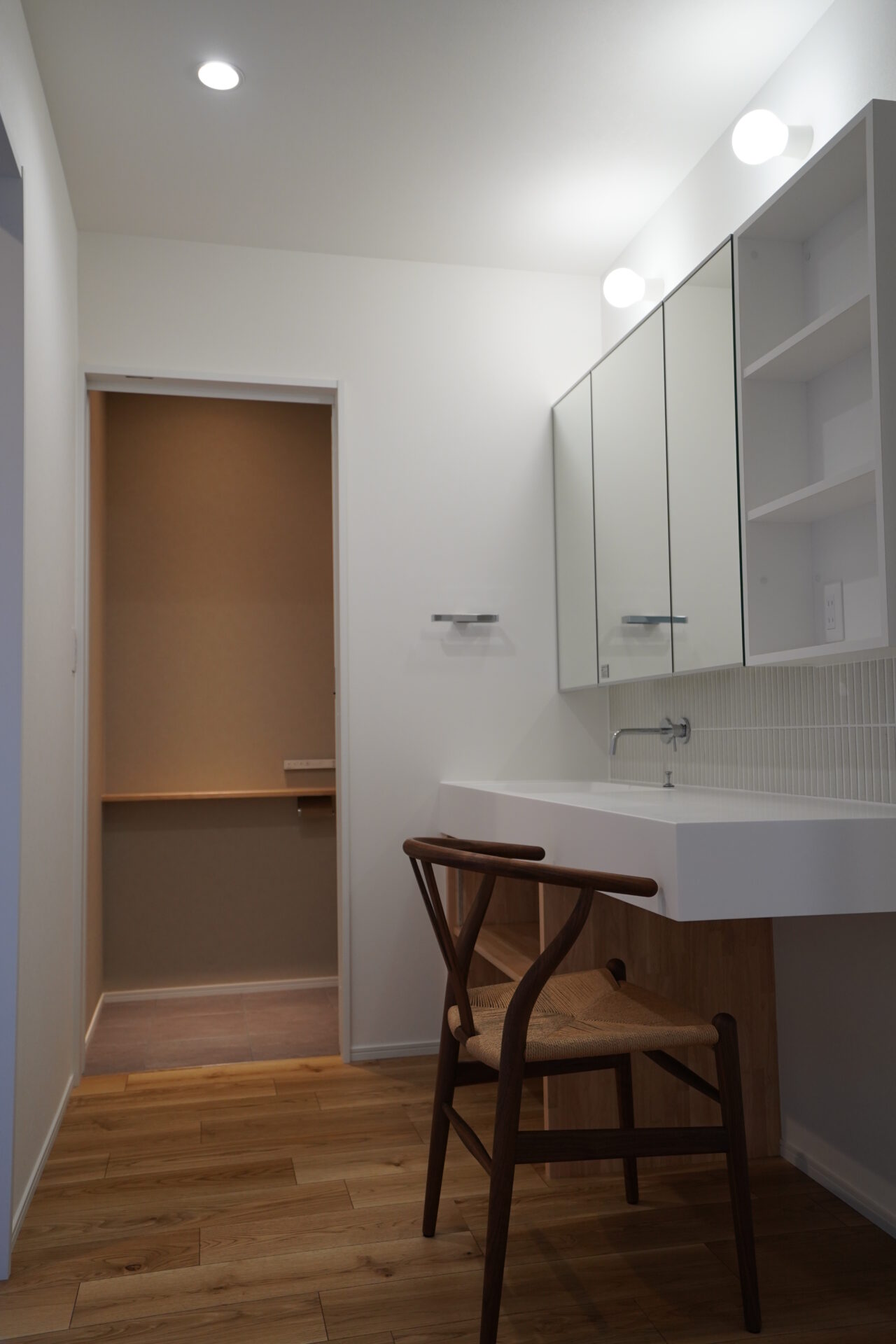 外観は、グレーの塗壁と木目を使い「落ち着いたかっこよさ」と「やわらかいぬくもり」が同時に見えるように、室内は造作洗面台や充実したユーティリティで、見せたい場所はデザイン良く、見せたくない家事スペースはスマートに隠す計画としました。大きな吹き抜けもあるので、部屋全体の室温が一定になるように断熱・気密はGX志向型住宅基準としました。