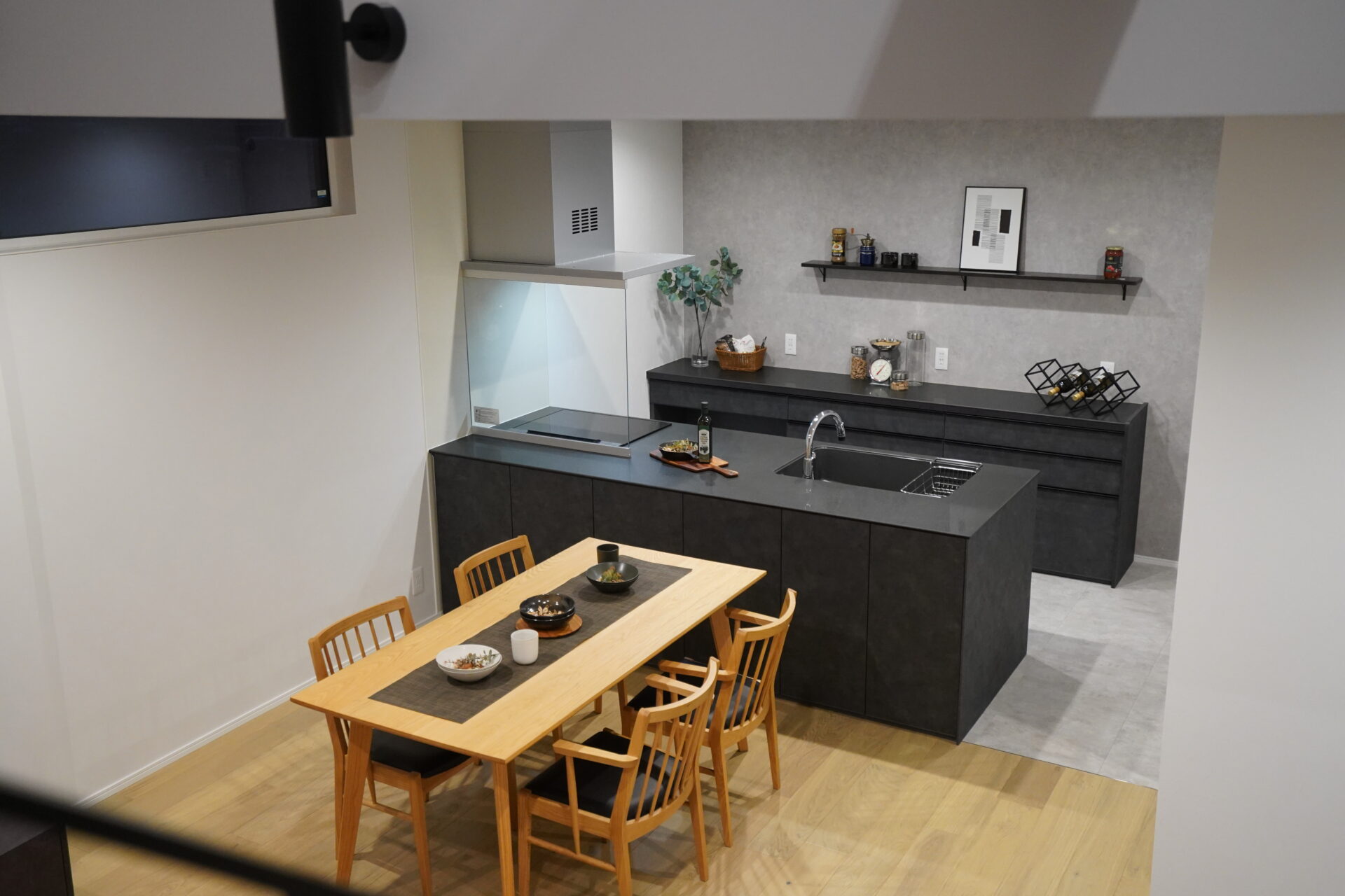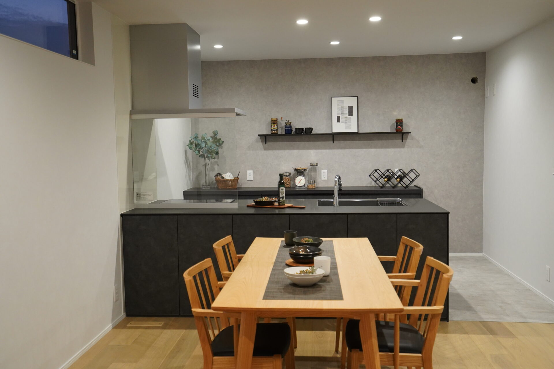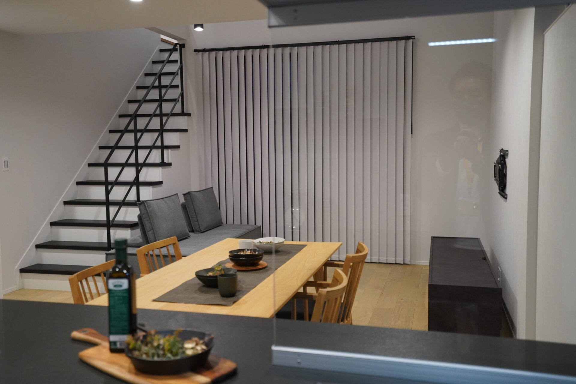 室内へ目を向ければ、キッチンや階段手摺に配した**「黒」**のアクセントが、光に溢れる空間をキリリと引き締めます。