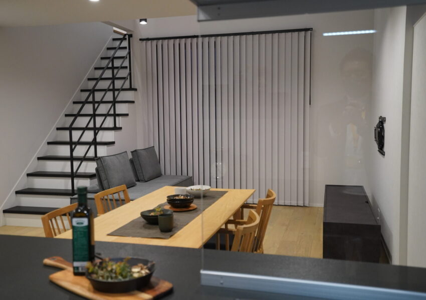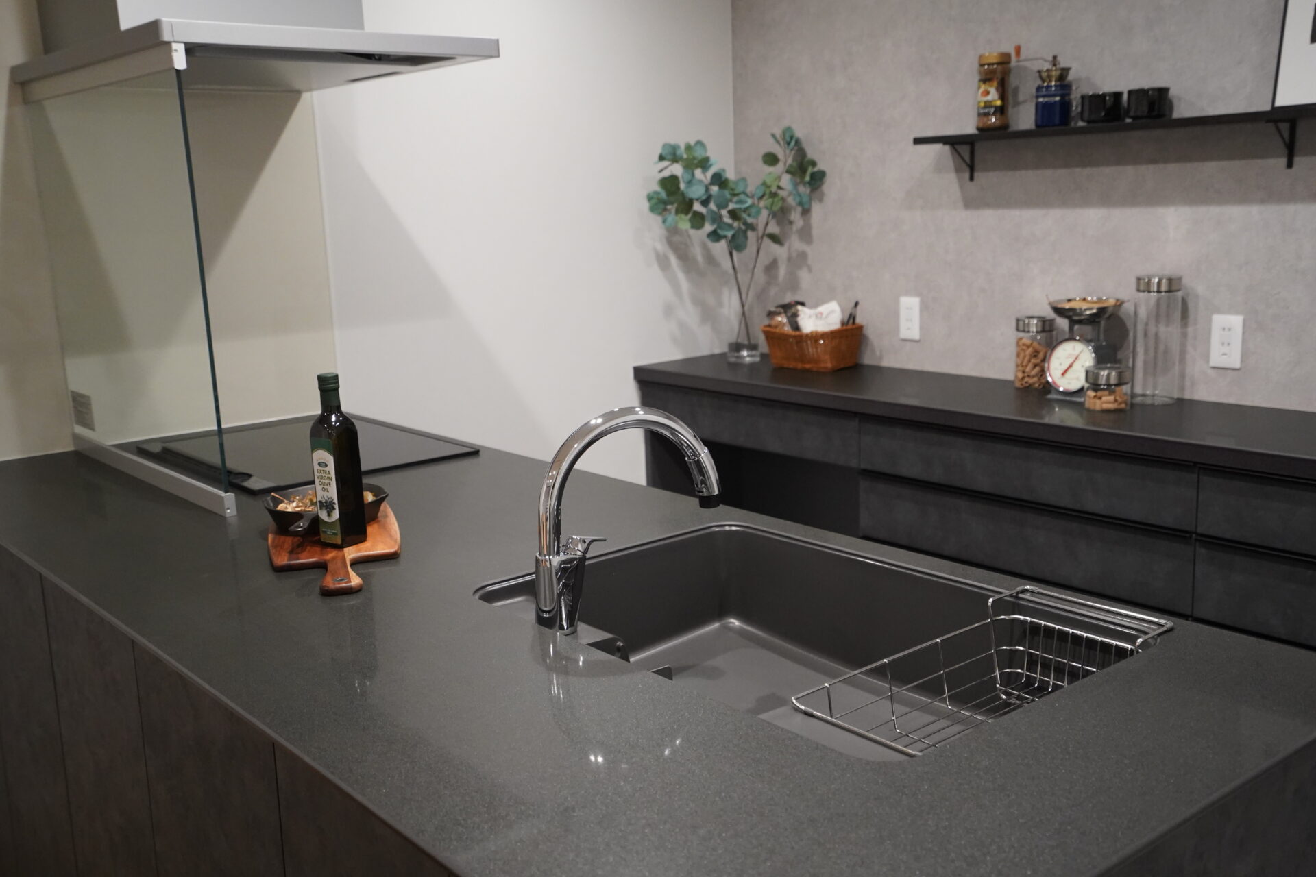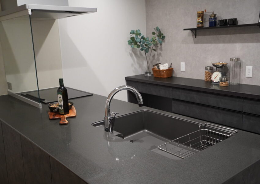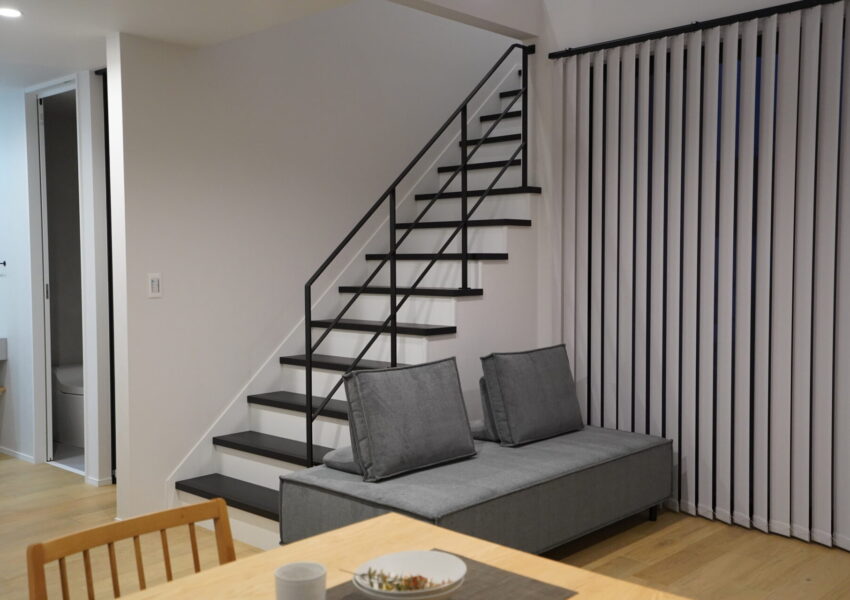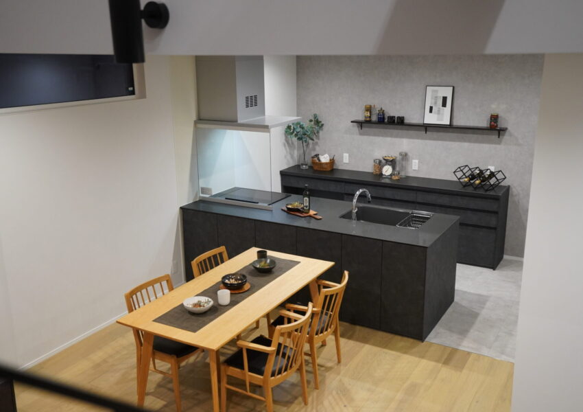室内へ目を向ければ、キッチンや階段手摺に配した**「黒」**のアクセントが、光に溢れる空間をキリリと引き締めます。