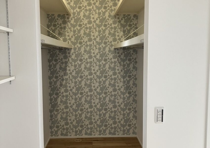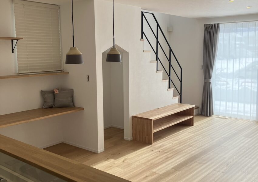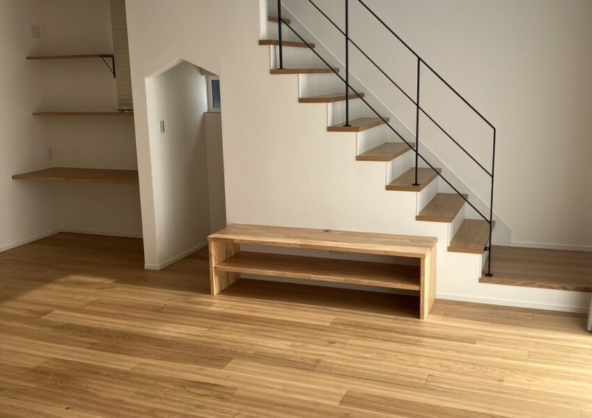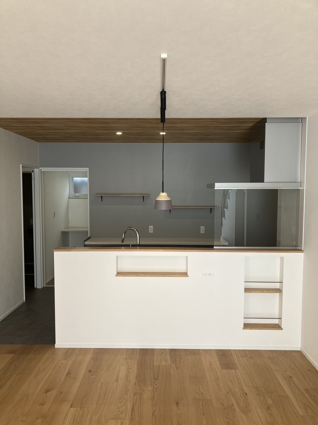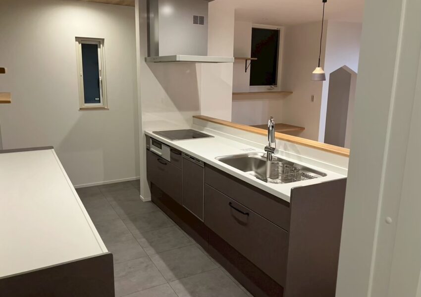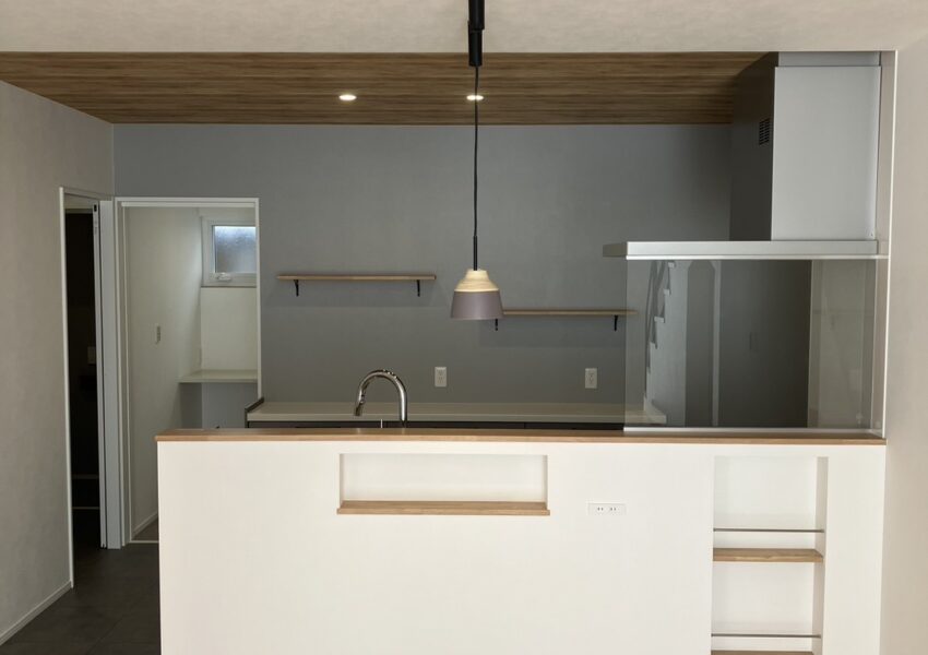 断熱・気密・耐震性能にこだわられたお家です。キッチンのガラスの壁は造作でつくってあり、より一層解放感があります。造作の棚やカウンター、階段下収納の入り口が三角になっているのも可愛い素敵なお家です。外観は塗壁を採用し、落ち着いた高級感のある印象になりました。