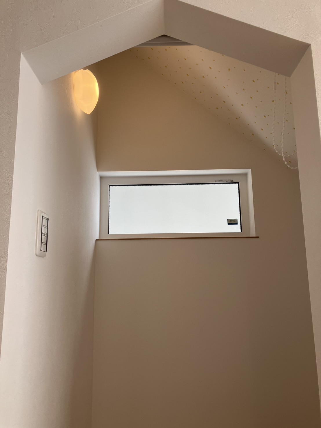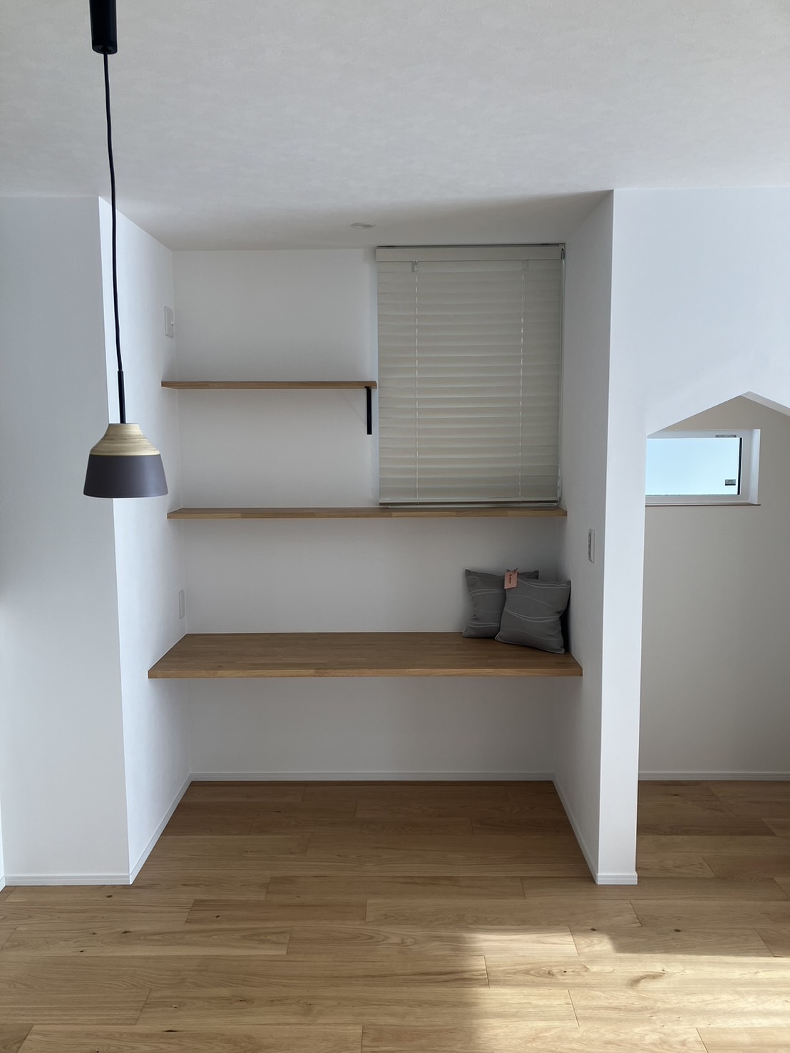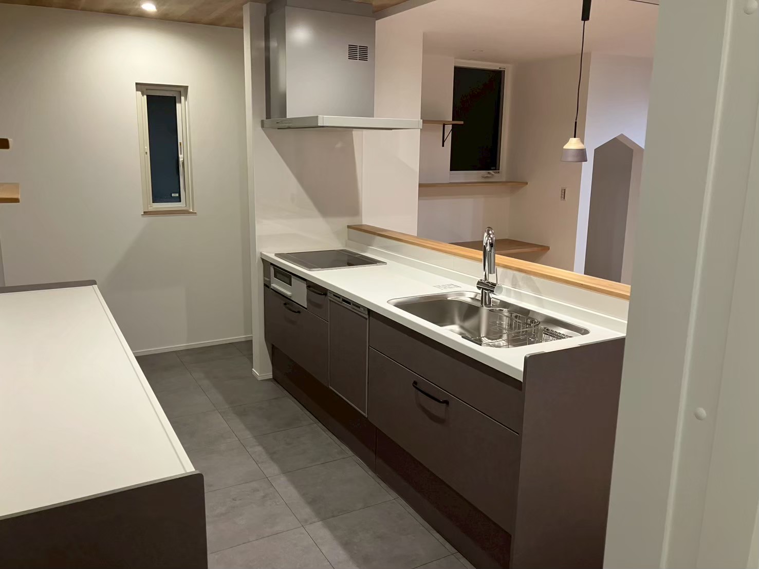 断熱・気密・耐震性能にこだわられたお家です。キッチンのガラスの壁は造作でつくってあり、より一層解放感があります。造作の棚やカウンター、階段下収納の入り口が三角になっているのも可愛い素敵なお家です。外観は塗壁を採用し、落ち着いた高級感のある印象になりました。