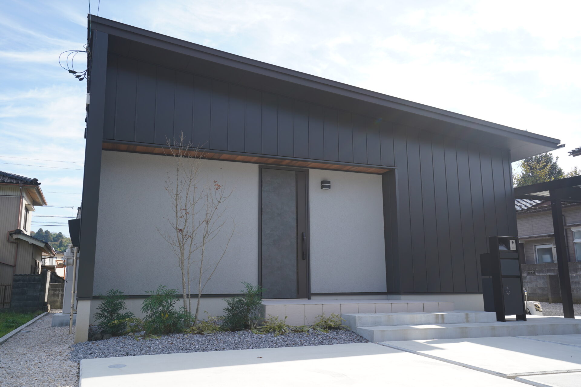 外観はシンプルな片流れのデザイン。ワンポイントで植栽を植えることでアクセントにしました。また、家族全員が使用できる大きなファミリークローゼットやご主人のこだわりの書斎も作りました。